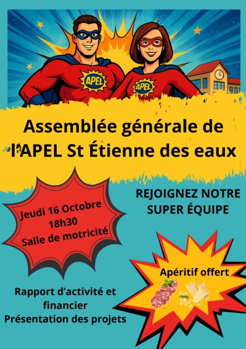 Venez découvrir les projets réalisés, et surtout ceux à venir lors de notre Assemblée Générale qui aura lieu jeudi 16 octobre à 18H30 en salle de motricité. Cette soirée se terminera autour d'un apéro convivial.